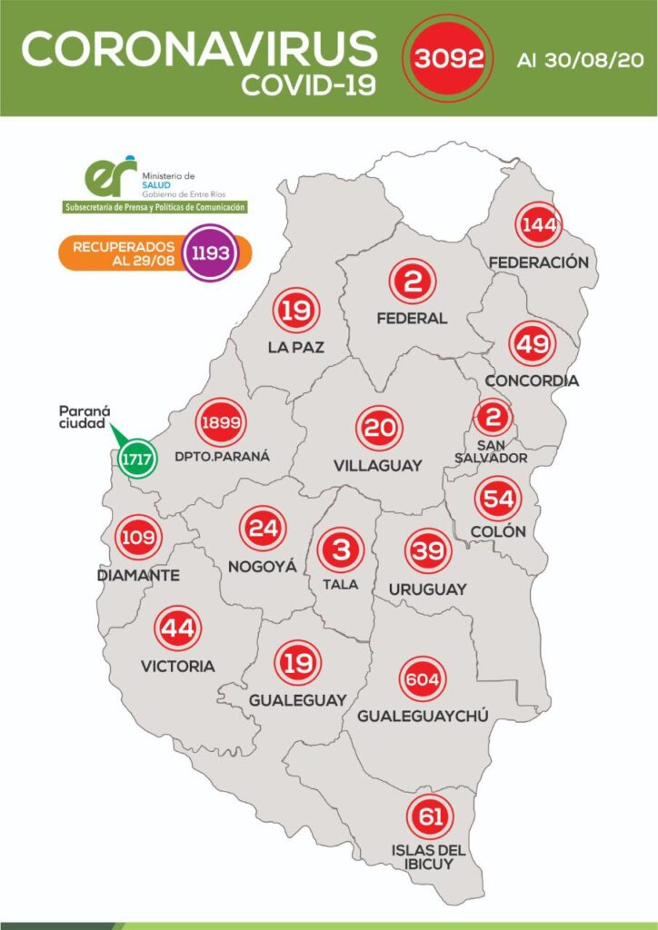 A partir de los datos reportados al 30 de Agosto de 2020 por el área de Vigilancia Epidemiológica del Ministerio de Salud, en Entre Ríos se han sumado 119 casos de Coronavirus.