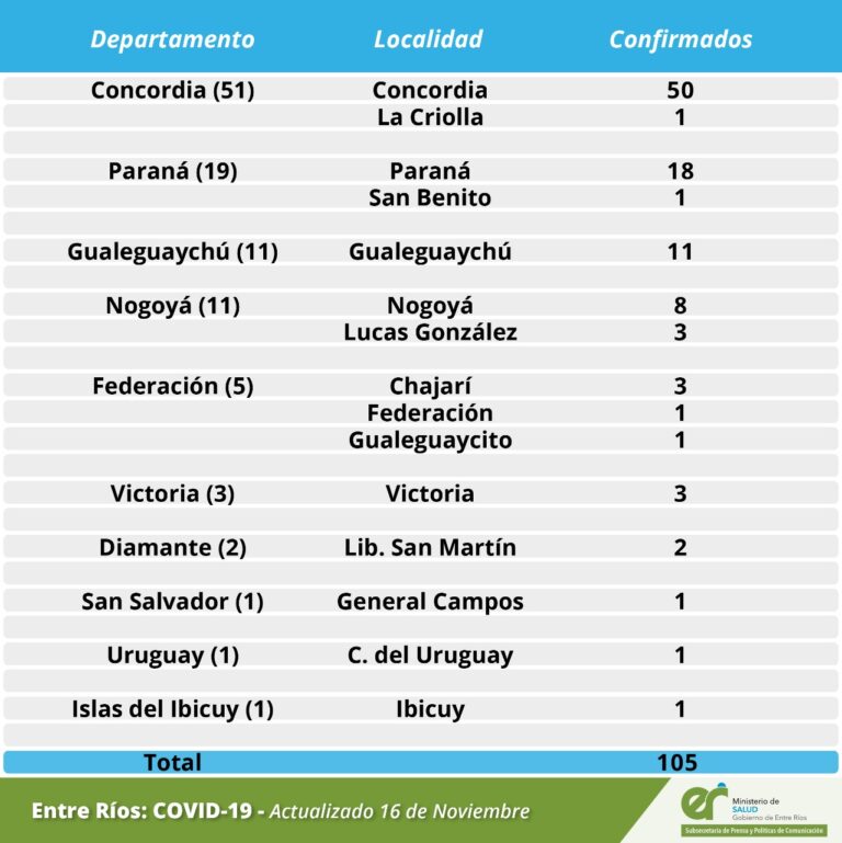 Concordia es la ciudad con más casos de coronavirus registrados hoy en la provincia Editor 16 noviembre, 2020