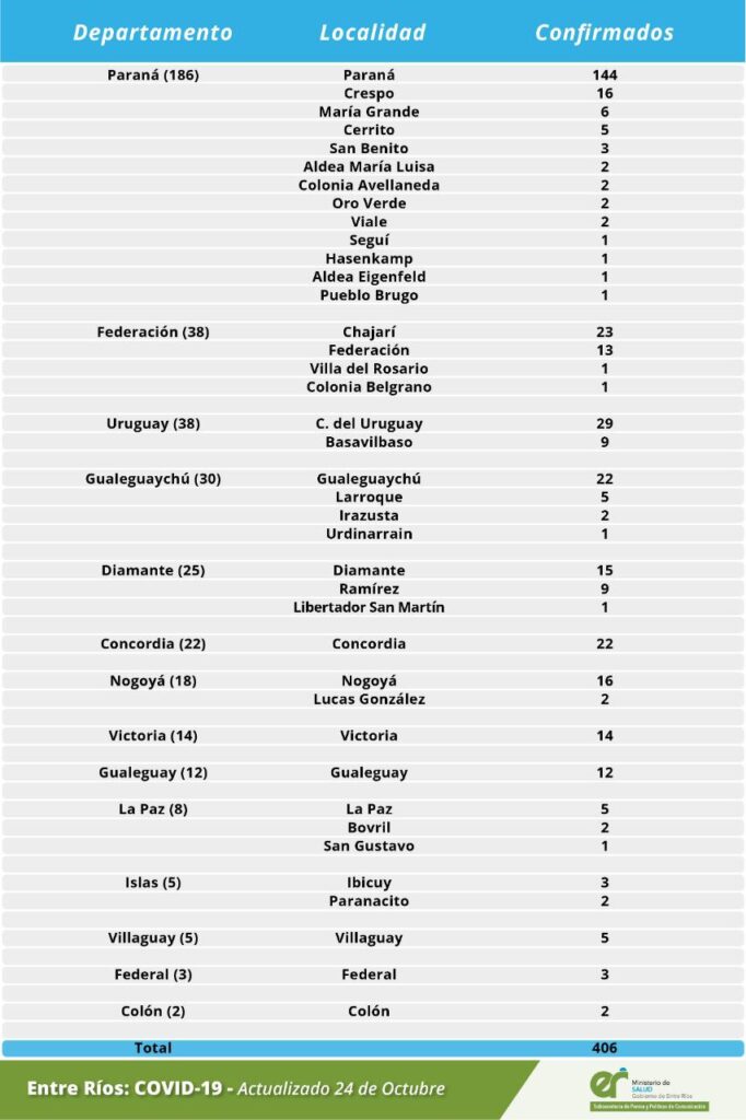 A partir de los datos reportados al 24 de Octubre de 2020 por el área de Vigilancia Epidemiológica del Ministerio de Salud, en Entre Ríos se han sumado 406 casos de Coronavirus.De ese modo, en la provincia son 13.771 los casos confirmados.Subsecretaria de Prensa y Políticas de Comunicación