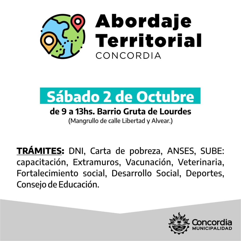 Este sábado 2 de octubre de 9hs a 13hs la Municipalidad de Concordia realizará un nuevo abordaje territorial en el barrio Gruta de Lourdes, más precisamente en la zona del mangrullo de calle Libertad y Alvear.