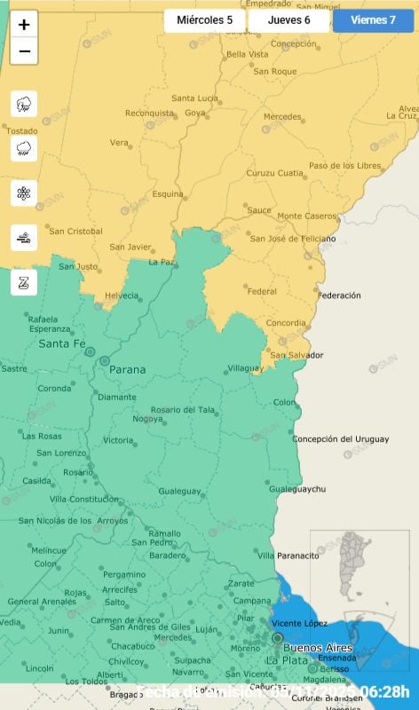El alerta es precisamente para el norte provincial, con cinco departamentos incluidos: Concordia, Federal, Federación, Feliciano y San Salvador. No se descarta que otras zonas queden comprendidas luego en esta advertencia.