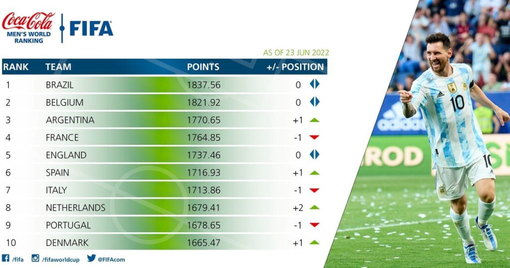 A menos de seis meses para que arranque el Mundial de Qatar, la FIFA actualizó su ranking de selecciones. La novedad para la Selección Argentina es más que positiva: le arrebató el tercer puesto de la tabla a Francia. Está en el podio, detrás de Bélgica (2°) y Brasil (1°) quienes no sufrieron cambios con respecto al último ranking. Mirá.