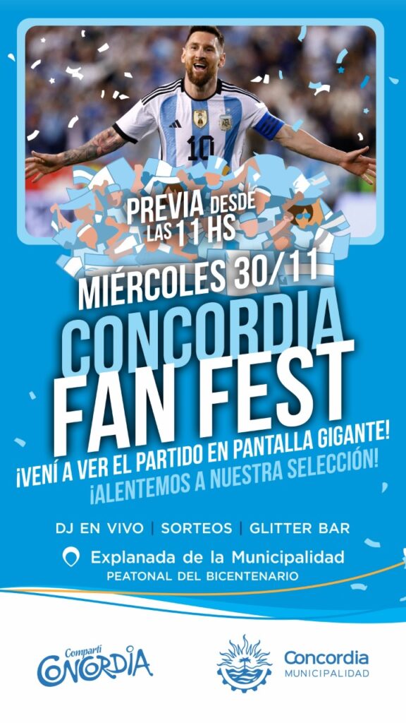 Por iniciativa del intendente Enrique Cresto; la Secretaría de Turismo, Cultura e Innovación de la Municipalidad de Concordia invita a alentar a la Selección Nacional en el “Concordia Fan Fest”, este miércoles 30 de noviembre en la Peatonal del Bicentenario, frente al Palacio Municipal.