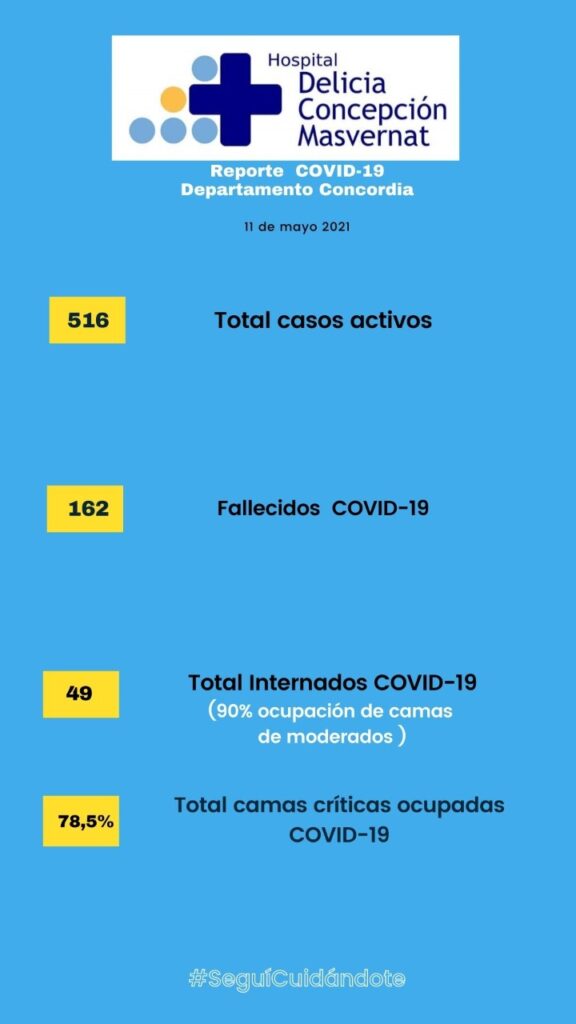 Según el reporte enviado por el área de prensa del Hospital Masvernat, hoy martes 11 de mayo, hay 516 casos activos de Covid-19, de los cuales 49 están internados y la ocupación de camas criticas Covid-19 alcanza el 78,5 %. El número de fallecidos en nuestra ciudad desde el comienzo de la pandemia asciende a 162.