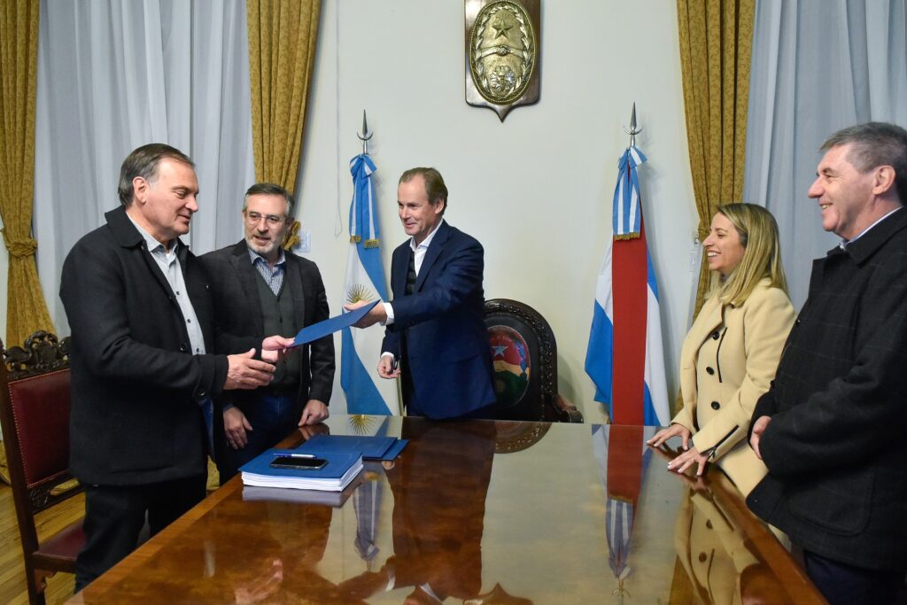 El mandatario, acompañado por la vicegobernadora Laura Stratta y el ministro de Economía, Hugo Ballay, recibió al intendente de San Salvador, Lucas Larrarte, para realizar el lanzamiento oficial de la licitación. También participaron el senador provincial Marcelo Berthet y el secretario de la Cámara de Industriales del Arroz, Roberto Pérez Mercader.