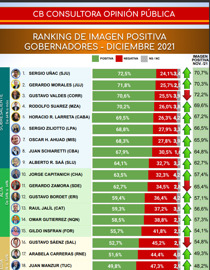 De esta manera, el mandatario entrerriano cierra el año con un aumento de un poco más de dos puntos porcentuales respecto de su marca en noviembre. Además se ubicó en el puesto N° 12 del ranking nacional de gobernadores que lideran Sergio Uñac, de San Juan, Gerardo Morales, de Jujuy y Gustavo Valdes, de Corrientes.