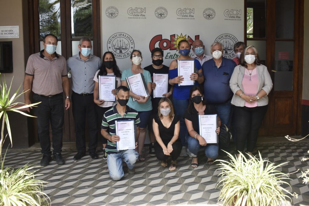 El acto de entrega de los beneficios tuvo lugar en la Municipalidad de Colón, y contó con la presencia del Intendente José Luis Walser, los vocales de CAFESG Eduardo Mozetic y Celeste Lorenz, el Viceintendente de Colón Ramiro Favre, el secretario de desarrollo comunitario Oscar López, la directora de empleo y producción Lina Bosch y la responsable del programa Microbanco, Rosana Godoy.