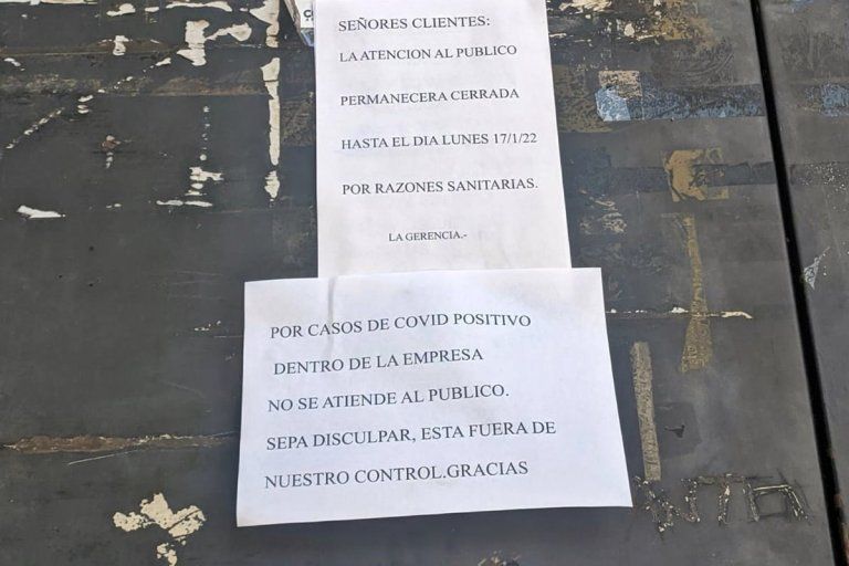 En el cartel se señala que “la atención al público permanecerá cerrada hasta el día lunes 17/1/22, por razones sanitarias”. Finalmente, el mensaje dice “sepa disculpar, está fuera de nuestro control. Gracias”.