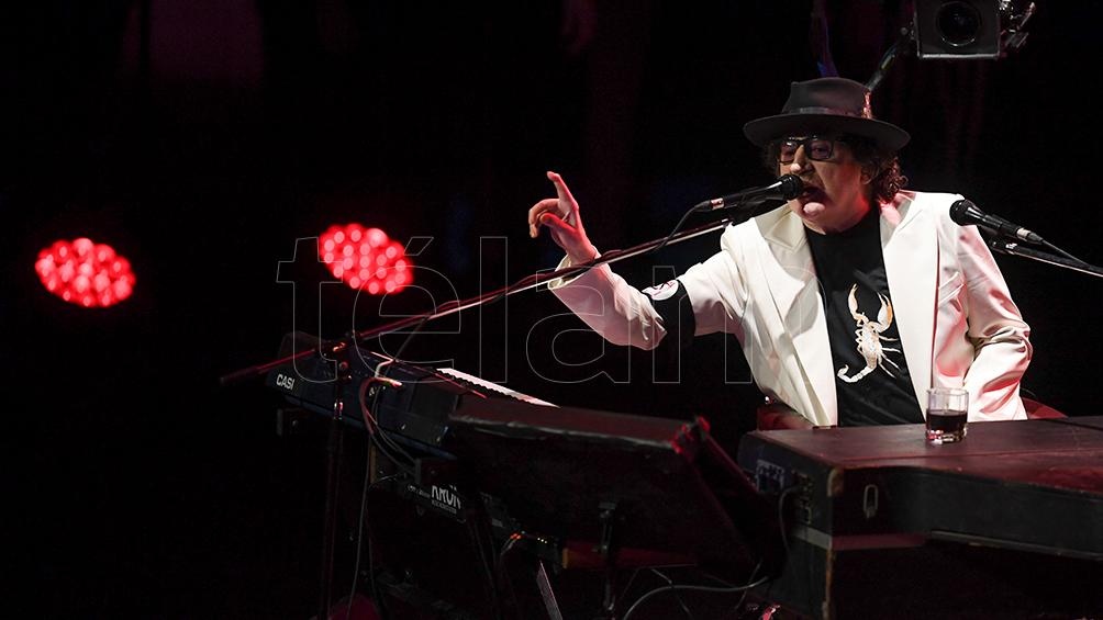 El gran rockstar argentino apareció sin aviso previo para cantar un rabioso “Cerca de la revolución”, al que siguió “Promesas sobre el bidet” y “Raros peinados nuevos”, en impagables versiones, en las que cantó sentado a los teclados.