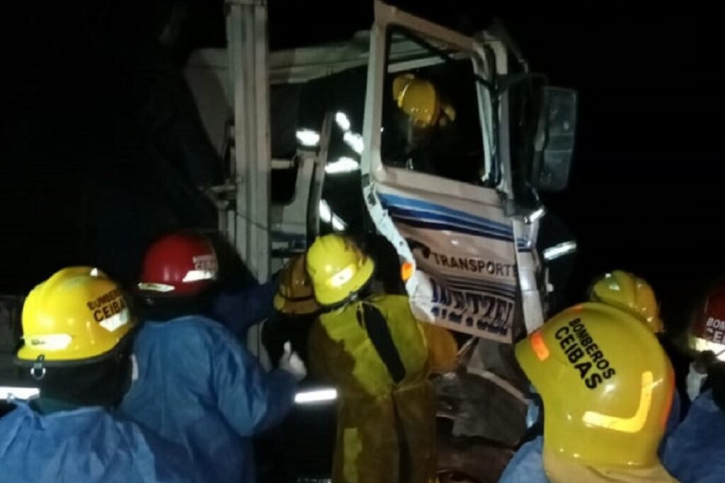 En el lugar se produjo el choque de dos camiones de gran porte y uno de los conductores quedó atrapado en la cabina por lo que debió ser rescatado por Bomberos de Gualeguaychú y Ceibas que actuaron durante el accidente.