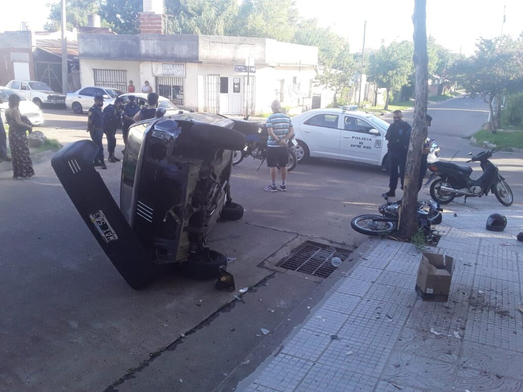 Un accidente vial ocurrió en la tarde de este viernes en la intersección de calles Corrientes y Bolivia. Ocurrió entre un Fiat 1 y una moto Zuzuki 100. Por el impacto, el automóvil quedó volcado y resultaron lesionadas tres personas que fueron trasladads al Hospital Delicia Concepción Masvernat.