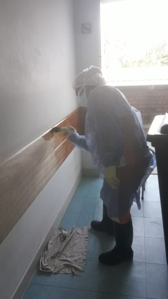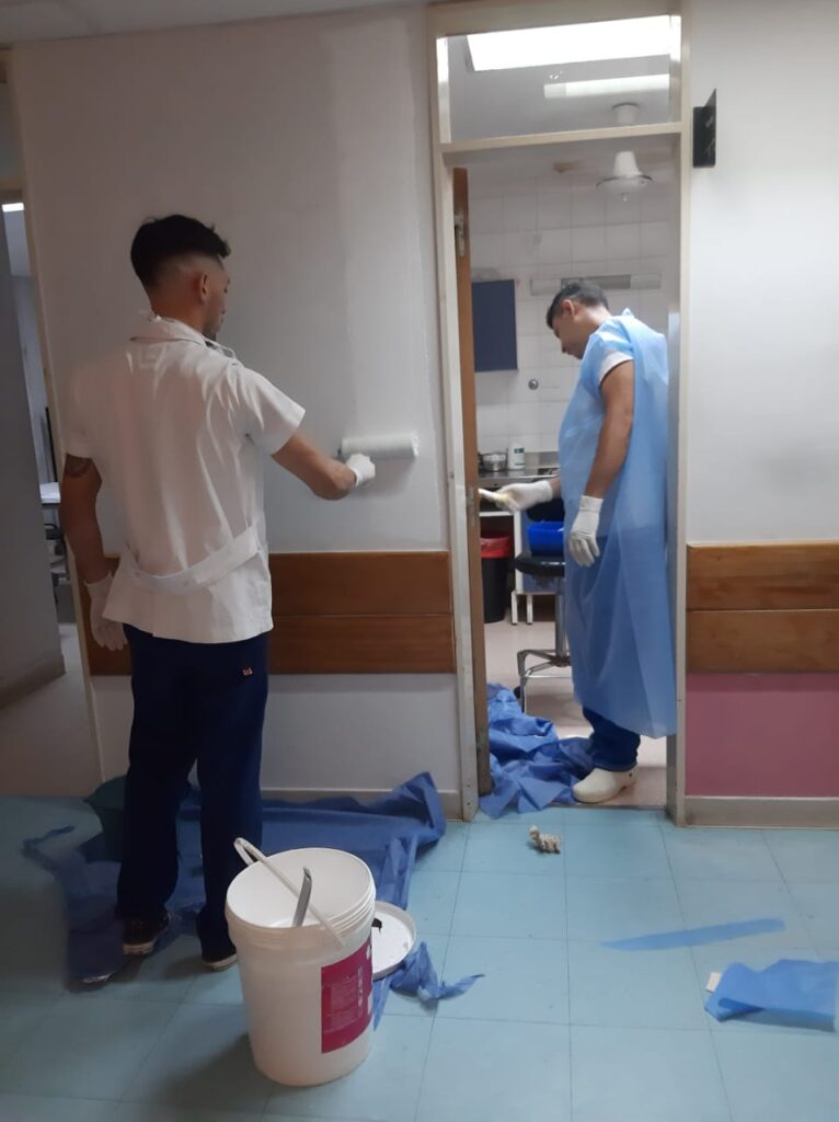 El Personal de la Unidad Respiratoria Agudos Covid-19 (URAC) redoblando el compromiso de su tarea habitual y aprovechando que durante varios días no hubo pacientes graves internados, decidieron en forma voluntaria y por iniciativa propia, pintar las salas y pasillos del área, la pintura fue donada por el mismo personal.