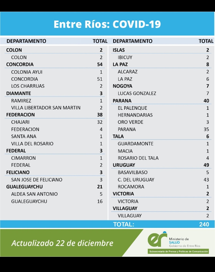 El reporte difundido por el área de Vigilancia Epidemiológica del Ministerio de Salud, registra que en Entre Ríos se han sumado 240 casos de Coronavirus este 22 de diciembre. De ese modo, en la provincia son 28.754 los casos confirmados desde el comienzo de la pandemia.