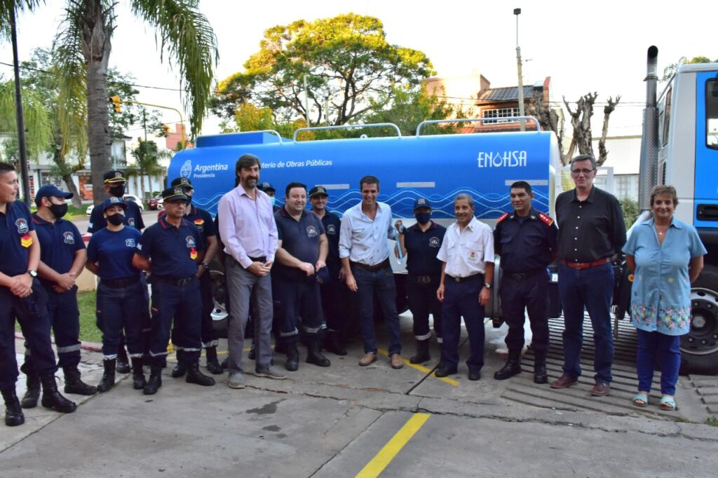 El titular del ENOHSA Enrique Cresto visitó el Cuartel de Bomberos Voluntarios de la ciudad de Concordia para formalizar la entrega de un moderno camión cisterna gestionado a través del Ministerio de Obras Públicas de la Nación y la Oficina de las Naciones Unidas de Servicios para Proyectos (UNOPS). Acompañaron al funcionario nacional el presidente de la Cámara de Diputados de la Provincia Ángel Giano, el diputado provincial Néstor Loggio y la secretaria municipal de Desarrollo Urbano Mireya López Bernis.