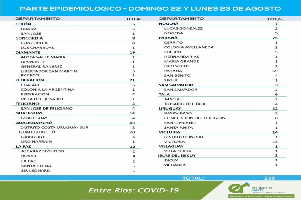 El área de Vigilancias Epidemiológica del Ministerio de Salud confirmó que en Entre Ríos se han sumado 238 casos de Coronavirus. Los mismos corresponden a la suma de dos días: 136 del domingo 22 y 102 del lunes 23 de agosto.