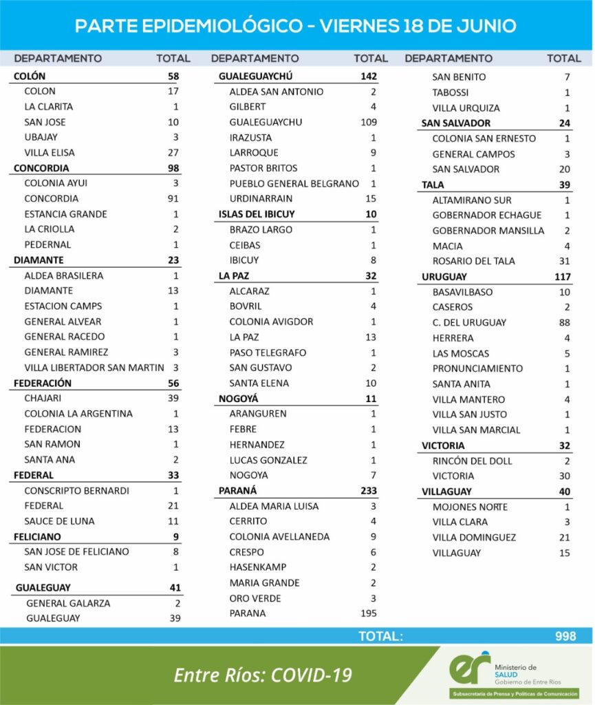 En virtud de los datos reportados este viernes 18 de junio por el área de Vigilancia Epidemiológica del Ministerio de Salud, en Entre Ríos se han sumado 998 casos de Coronavirus.