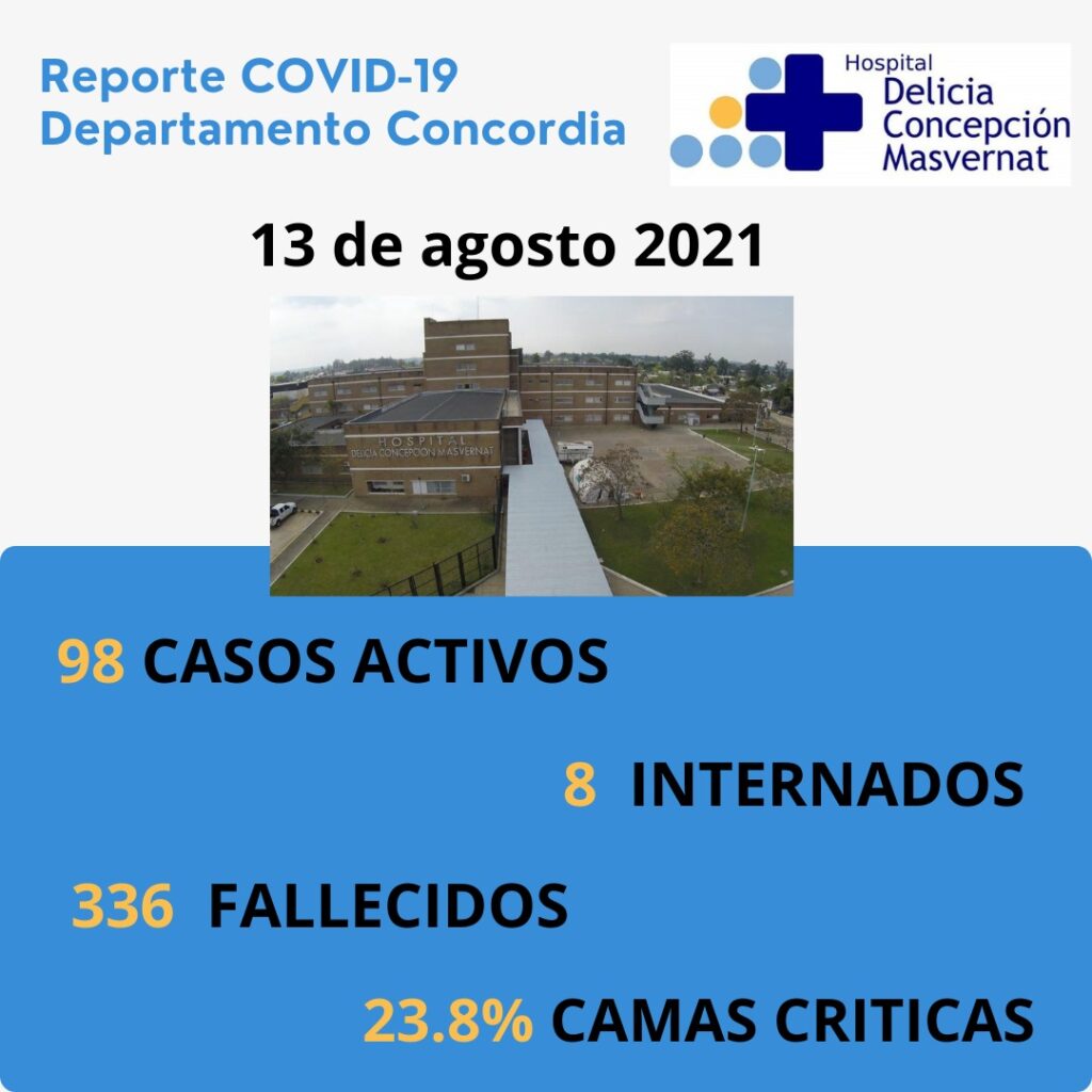 Según el reporte enviado por el área de prensa del Hospital Masvernat, hoy viernes 13 de agosto, hay 98 casos activos de Covid-19, de los cuales 8 están internados, la ocupación de camas criticas Covid-19 alcanza el 23,8%. El número de fallecidos en nuestra ciudad desde el comienzo de la pandemia asciende a 336