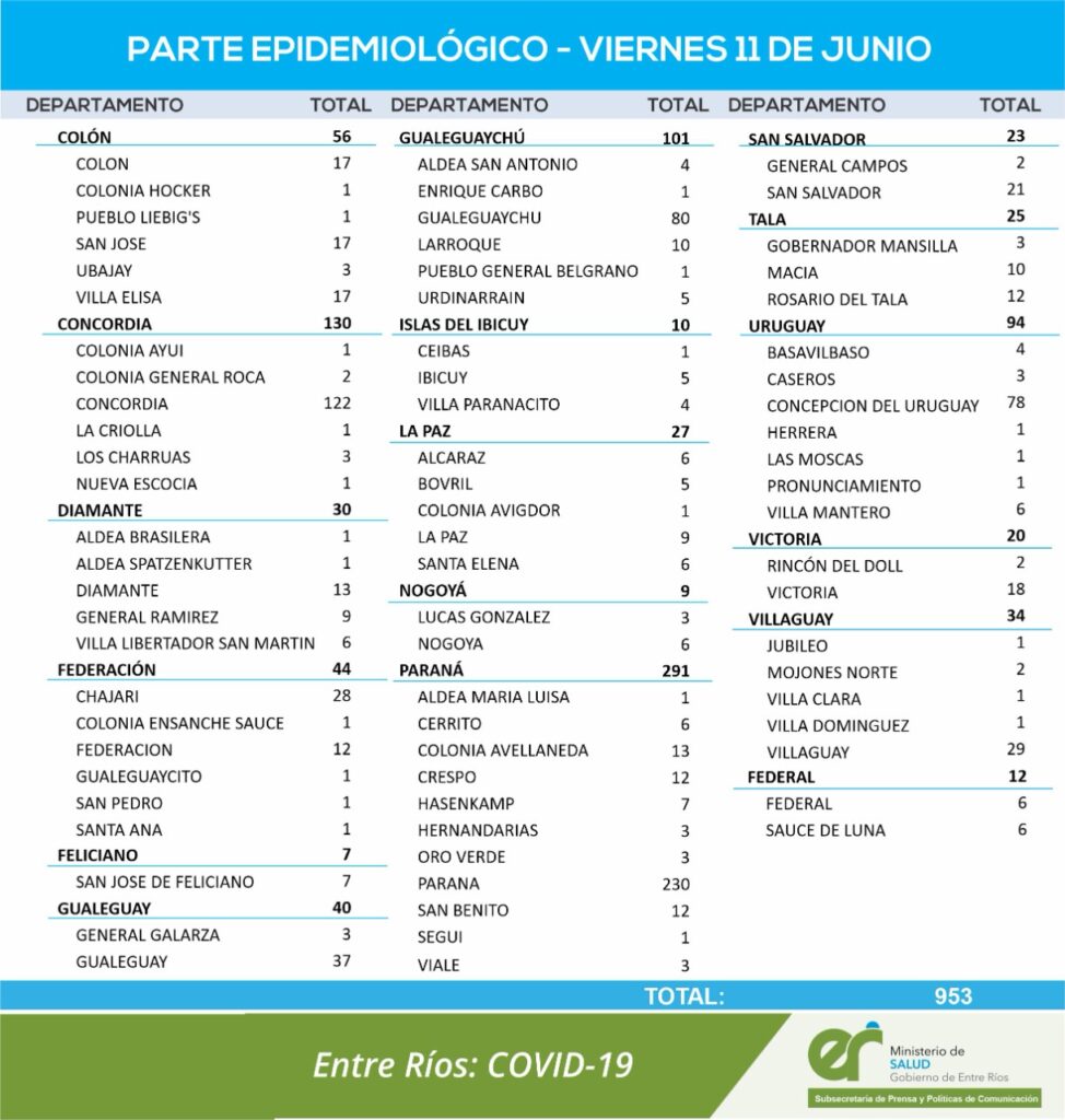 En virtud de los datos reportados este viernes 11 de junio por el área de Vigilancia Epidemiológica del Ministerio de Salud, en Entre Ríos se han sumado 953 casos de Coronavirus.