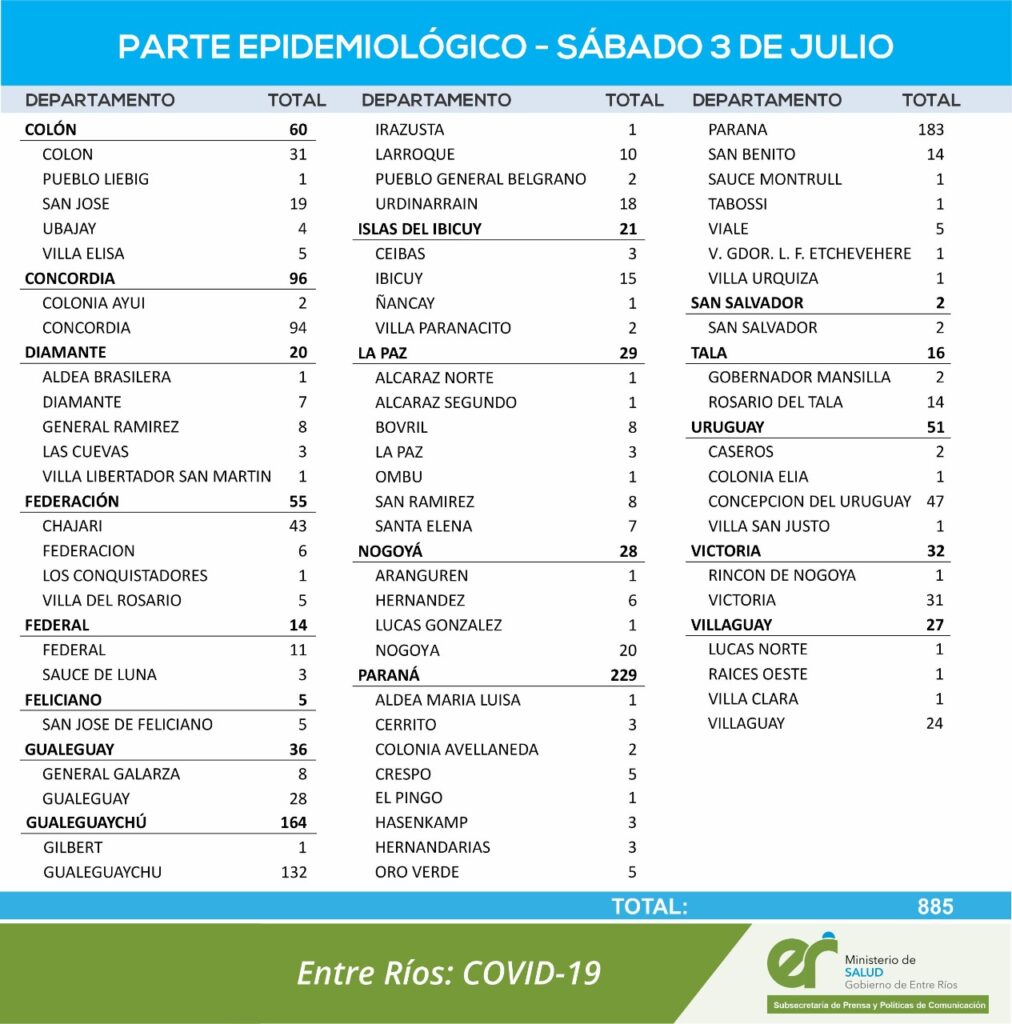 En virtud de los datos reportados este sábado 3 de julio por el área de Vigilancia Epidemiológica del Ministerio de Salud, en Entre Ríos se han sumado 885 casos de Coronavirus.