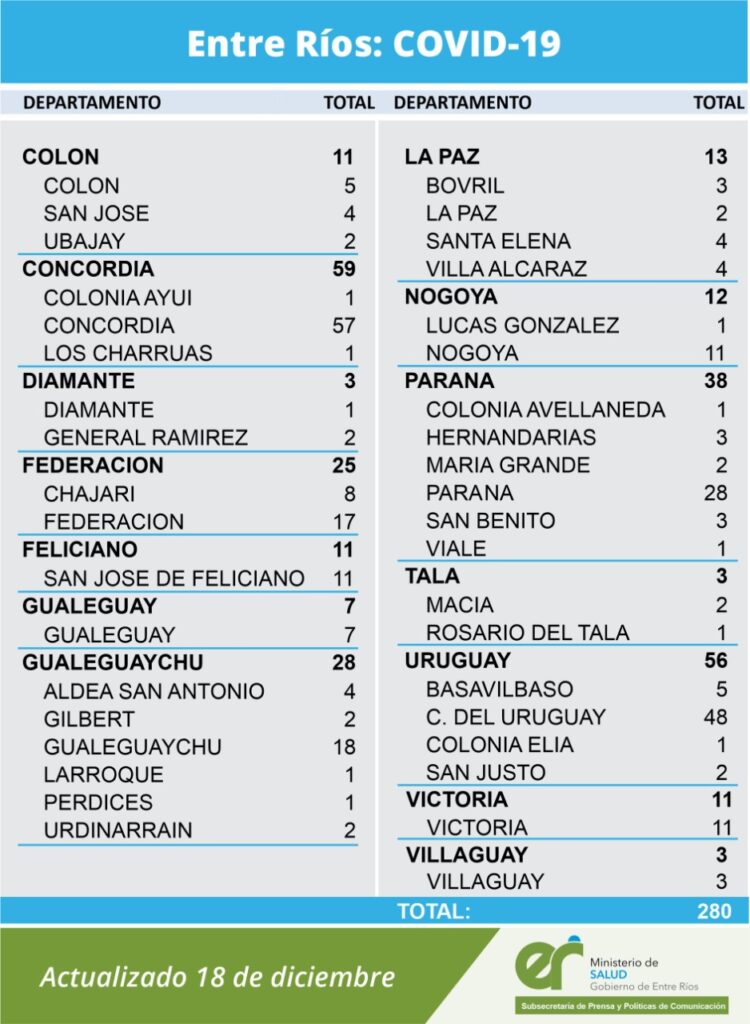 A partir de los datos reportados al 18 de Diciembre de 2020 por el área de Vigilancia Epidemiológica del Ministerio de Salud, en Entre Ríos se han sumado 280 casos de Coronavirus.