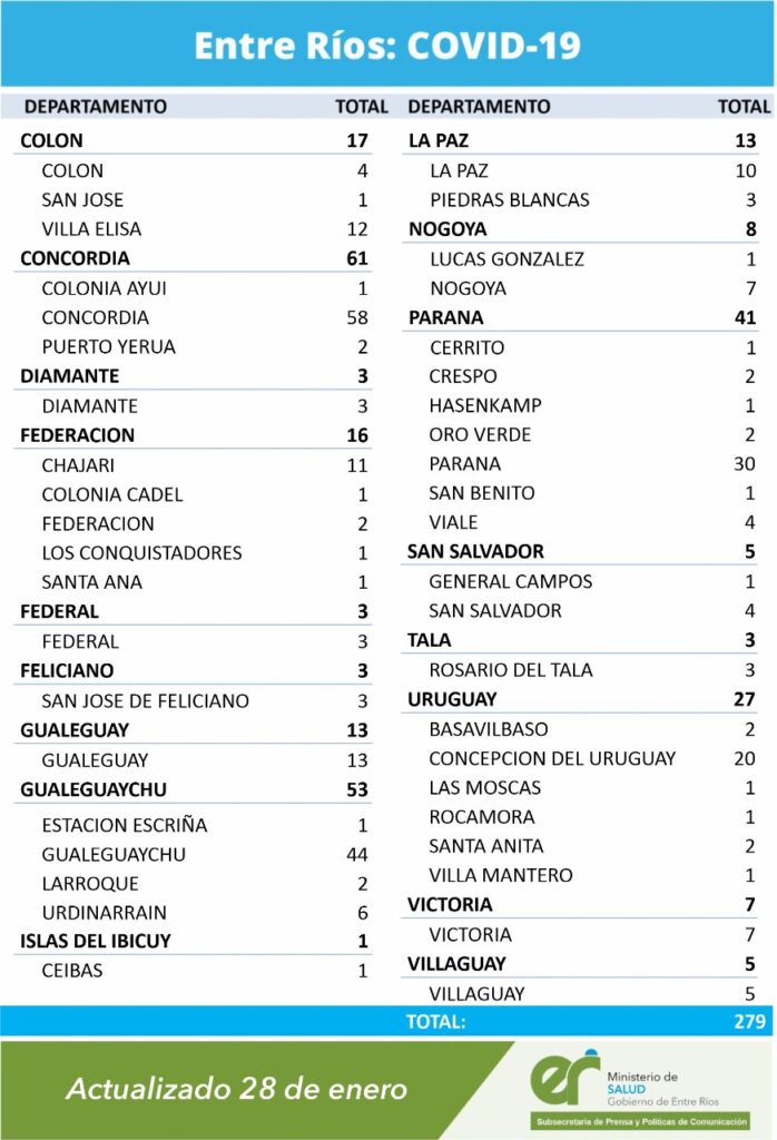 En virtud de los datos reportados al 28 de enero de 2021 por el área de Vigilancia Epidemiológica del Ministerio de Salud, en Entre Ríos se han sumado 279 casos de Coronavirus.