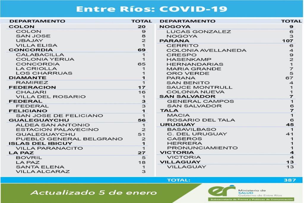 A partir de los datos reportados al 5 de Enero de 2021 por el área de Vigilancia Epidemiológica del Ministerio de Salud, en Entre Ríos se han sumado 387 casos de Coronavirus.