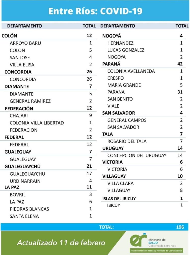 En virtud de los datos reportados al 11 de febrero de 2021 por el área de Vigilancia Epidemiológica del Ministerio de Salud, en Entre Ríos se han sumado 196 casos de Coronavirus.