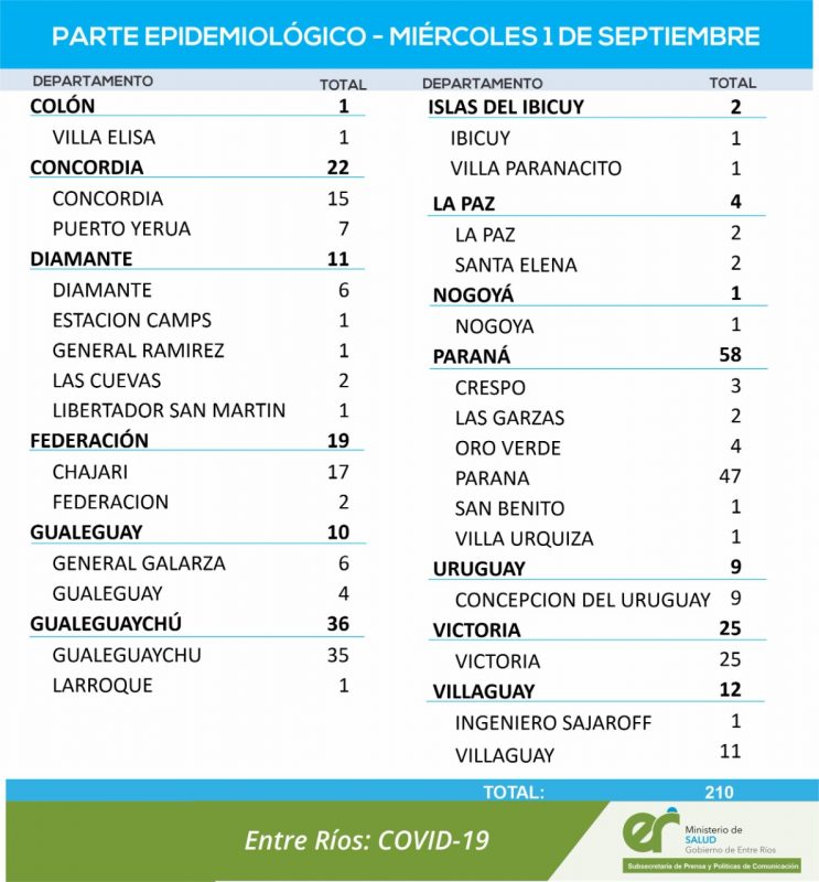 En virtud de los datos reportados por el área de Vigilancia Epidemiológica del Ministerio de Salud este miércoles 1 de septiembre, en Entre Ríos se han sumado 210 casos de Coronavirus.De ese modo, en la provincia son 135.589 los casos confirmados.