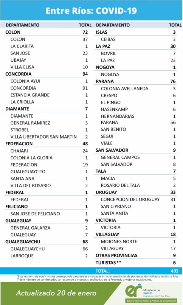 En virtud de los datos reportados al 20 de enero de 2021 por el área de Vigilancia Epidemiológica del Ministerio de Salud, en Entre Ríos se han sumado 493 casos de Coronavirus.