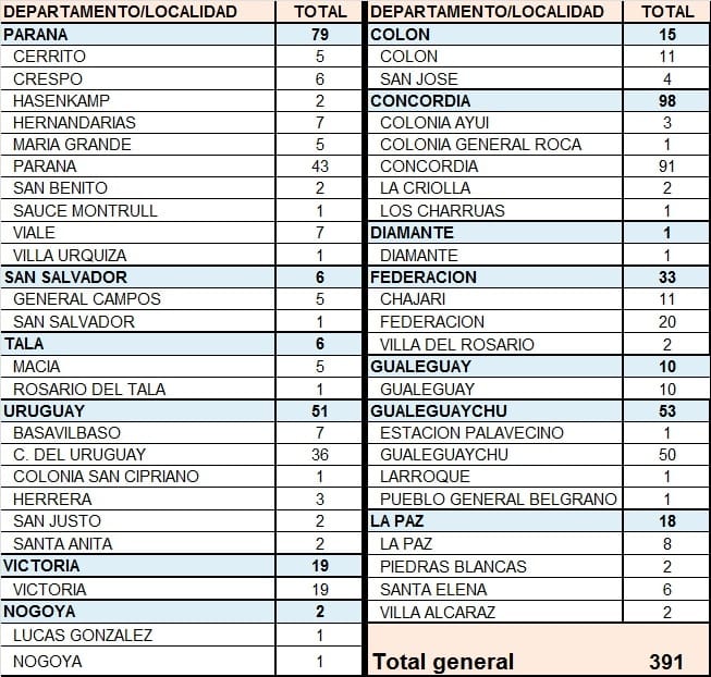 A partir de los datos reportados al 31 de Diciembre de 2020 por el área de Vigilancia Epidemiológica del Ministerio de Salud, en Entre Ríos se han sumado 391 casos de Coronavirus.