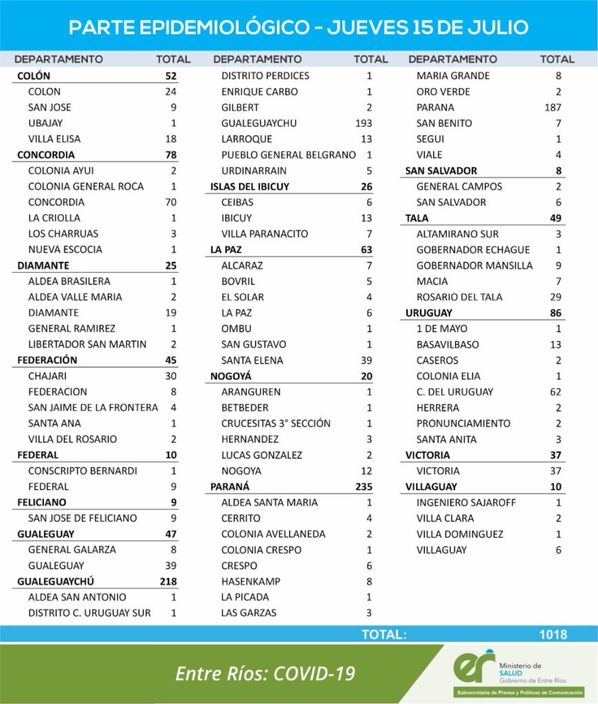 En virtud de los datos reportados por el área de Vigilancia Epidemiológica del Ministerio de Salud este jueves 15 de julio, en Entre Ríos se han sumado 1.018 casos de Coronavirus.