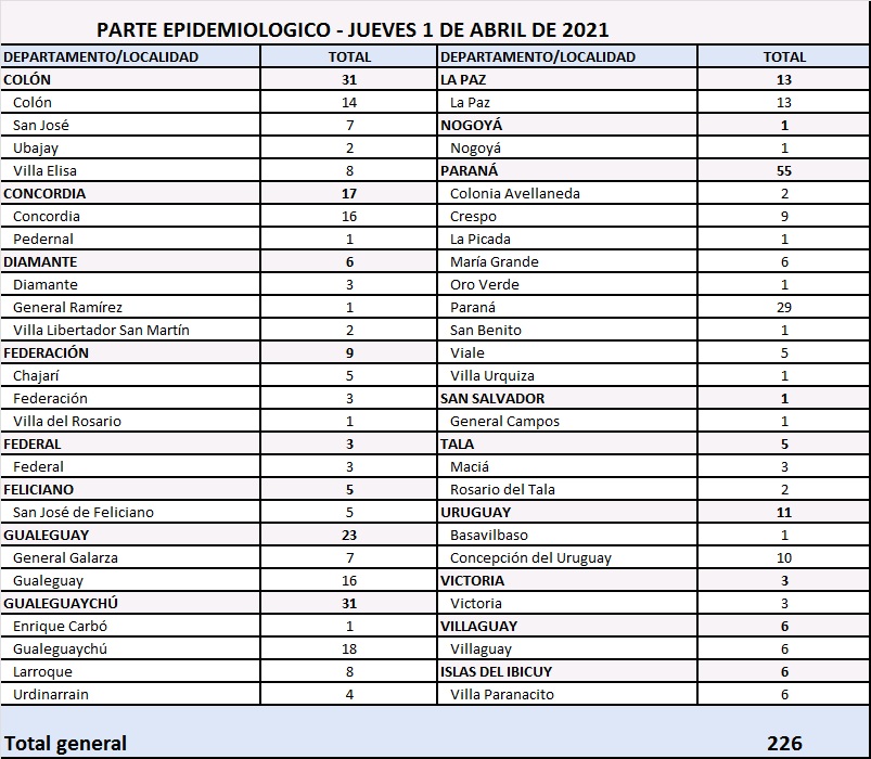 En virtud de los datos reportados al 1 de abril de 2021 por el área de Vigilancia Epidemiológica del Ministerio de Salud, en Entre Ríos se han sumado 226 casos de Coronavirus.