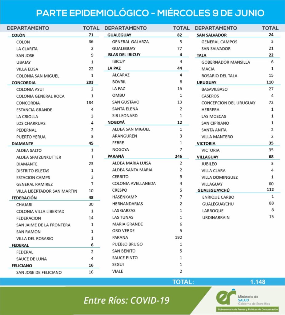 En virtud de los datos reportados este miércoles 9 de junio por el área de Vigilancia Epidemiológica del Ministerio de Salud, en Entre Ríos se han sumado 1.148 casos de Coronavirus.