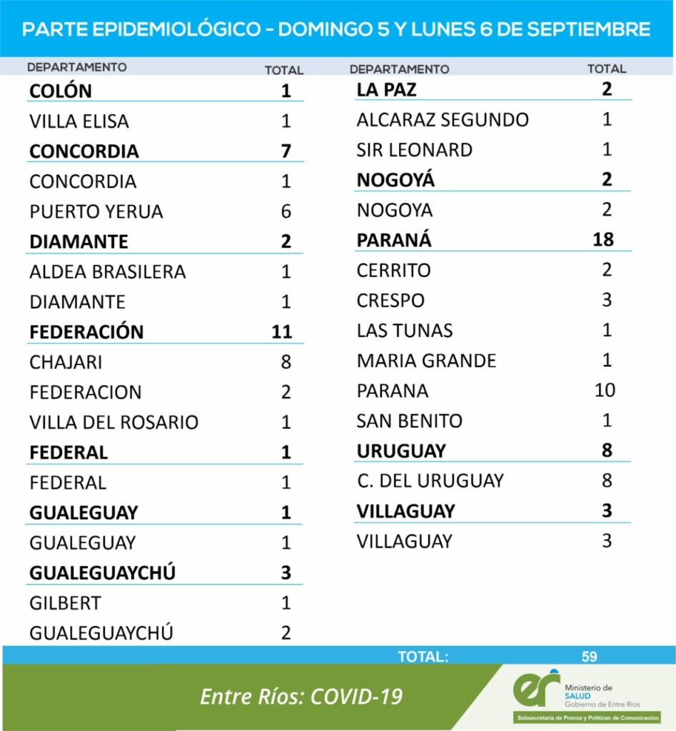En virtud de los datos reportados por el área de Vigilancia Epidemiológica del Ministerio de Salud, en Entre Ríos se han sumado 59 casos de Coronavirus.
