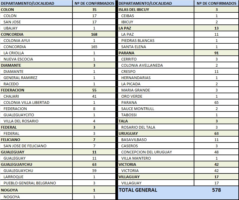 A partir de los datos reportados al 2 de Enero de 2021 por el área de Vigilancia Epidemiológica del Ministerio de Salud, en Entre Ríos se han sumado 578 casos de Coronavirus.