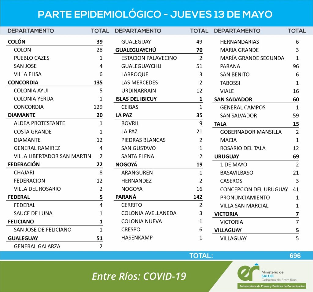 En virtud de los datos reportados este jueves 13 de mayo por el área de Vigilancia Epidemiológica del Ministerio de Salud, en Entre Ríos se han sumado 696 casos de Coronavirus.