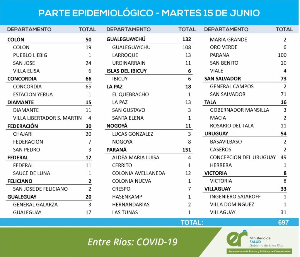 En virtud de los datos reportados este martes 15 de junio por el área de Vigilancia Epidemiológica del Ministerio de Salud, en Entre Ríos se han sumado 697 casos de Coronavirus.