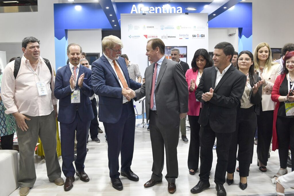 Bordet compartió el acto de apertura desde el stand de Argentina junto al cónsul general. En ese marco, destacó que la delegación entrerriana “es la más nutrida que participa en Apimondia, la feria más importante de miel en el mundo”.