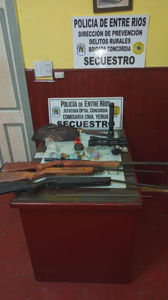 Al requisar el vehículo se hallaron Tres Aire comprimidos adaptados a calibre .22, cartuchería de distintos calibre, Dos miras telescópicas, Dos linternas (una tipo minera) , Un cuchillo de aprox. 40cm. El fiscal dispuso que los dos masculinos sean aprehendidos y alojados en la alcaidía, a disposición de las autoridades judiciales.