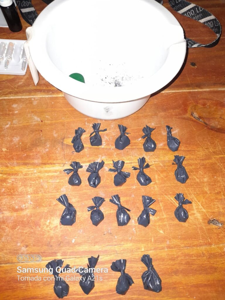 Como resultado de ambos procedimientos se logró el Secuestro de un total de: (13,2grs.) de cocaína distribuidos en trozo compacto y en envoltorios, (266,7grs.) de marihuana distribuidos de igual manera que la cocaína; (37) plantas de marihuana con un peso total en deshoje de (1.097grs), una importante suma en dinero en efectivo; también se secuestraron varios celulares, elementos de corte y fraccionamiento, distintos elementos con restos de cocaína y marihuana, licuadoras; monederos, pen drive, tablets, además se halló un invernadero armado de forma casera.