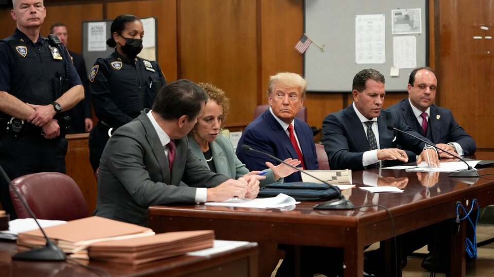 “Parece surrealista. Wow, me van a detener”, dijo Trump en su red Truth Social camino a la corte. El exmandatario se presentó ante el tribunal neoyorquino de Manhattan poco después de haberse entregado a la Fiscalía, donde le leyeron sus derechos y fue fichado. Sentado entre sus abogados, a Trump se lo vio con un semblante apagado, según una foto tomada dentro de la sala, tras someterse al protocolo habitual que incluyó toma de huellas dactilares y fotos para la ficha policial.