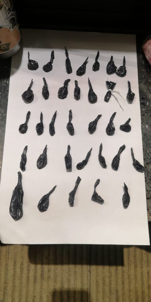 Una de ellos llevaba una riñonera de cuero negra, notando un absoluto nerviosismo de ambas personas, eguidamente se solicitó una Orden de Requisa y al recibir la autorización, se procedió con la misma encontrando en el interior de la riñonera más de $ 12.000 pesos y unos 11 envoltorios de nylon conteniendo en su interior, sustancia vegetal sospechada como Marihuana.