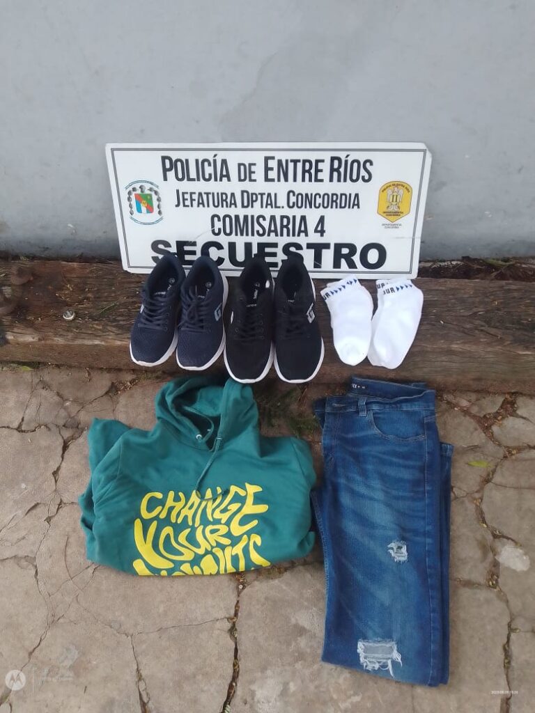 Seguidamente se amplía la patrulla en la zona y en virtud de las características, se los encuentra a unos metros del lugar, pudiendo comprobar que efectivamente llevaban entre sus prendas varias prendas de vestir nuevas, dos pares de zapatillas nuevas; un buzo de algodón nuevo; un jeans nuevo y dos pares de medias nuevas) con sus correspondientes etiquetas.