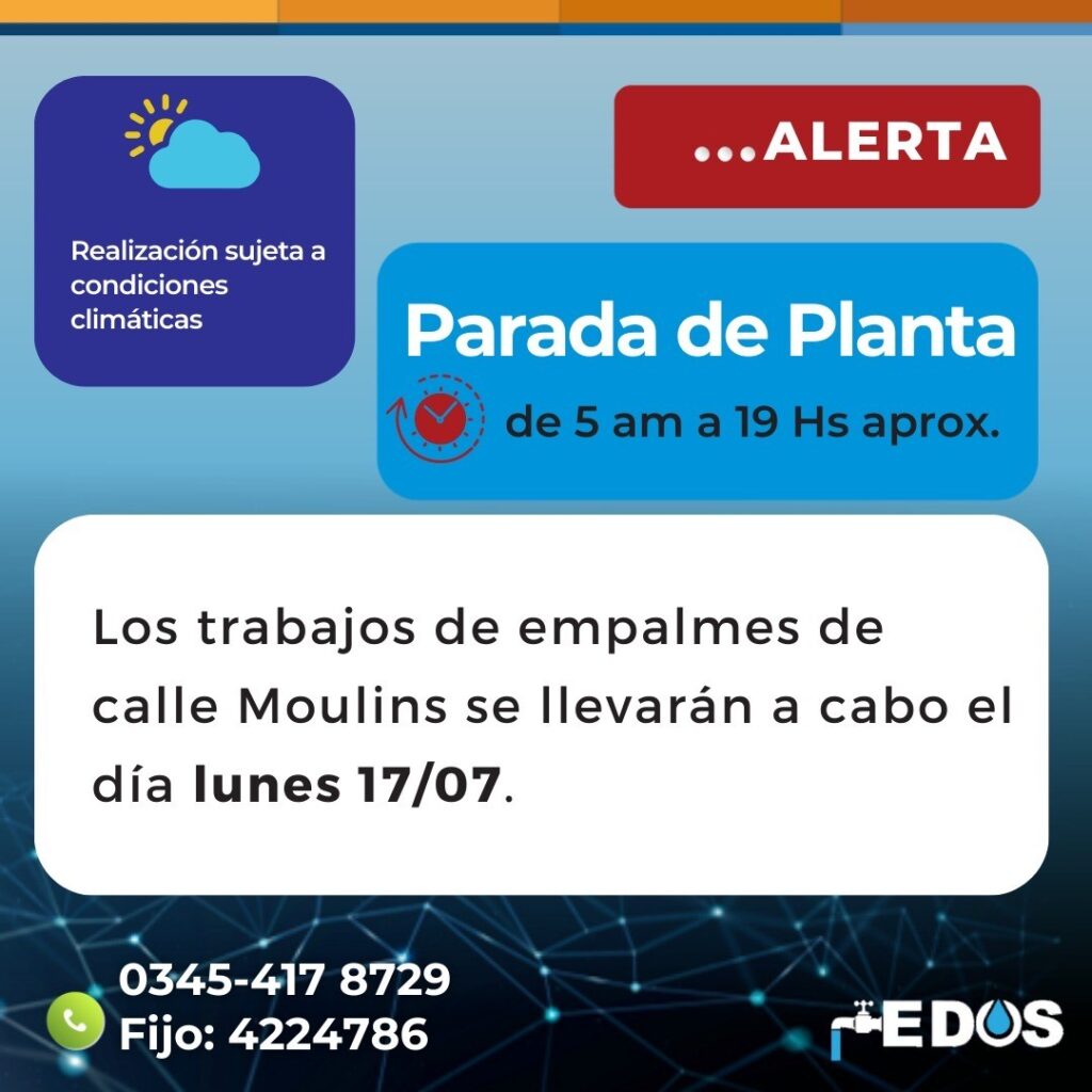 Debido a los trabajos de empalme de cañerías a realizarse en calle Moulins, el servicio de suministro de agua se verá resentido durante el día lunes en el horario de 5 AM a 7 PM.