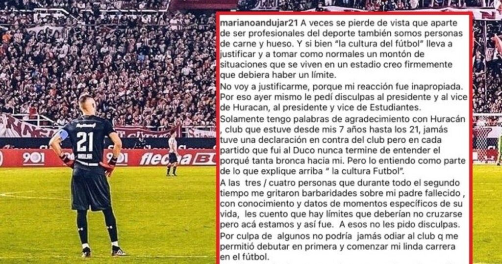 “A las tres / cuatro personas que durante todo el segundo tiempo me gritaron barbaridades sobre mi padre fallecido, con conocimiento y datos de momentos específicos de su vida, les cuento que hay límites que deberían no cruzarse pero acá estamos y así fue. A esos no les pido disculpas”, se descargó Andújar. Crudo.