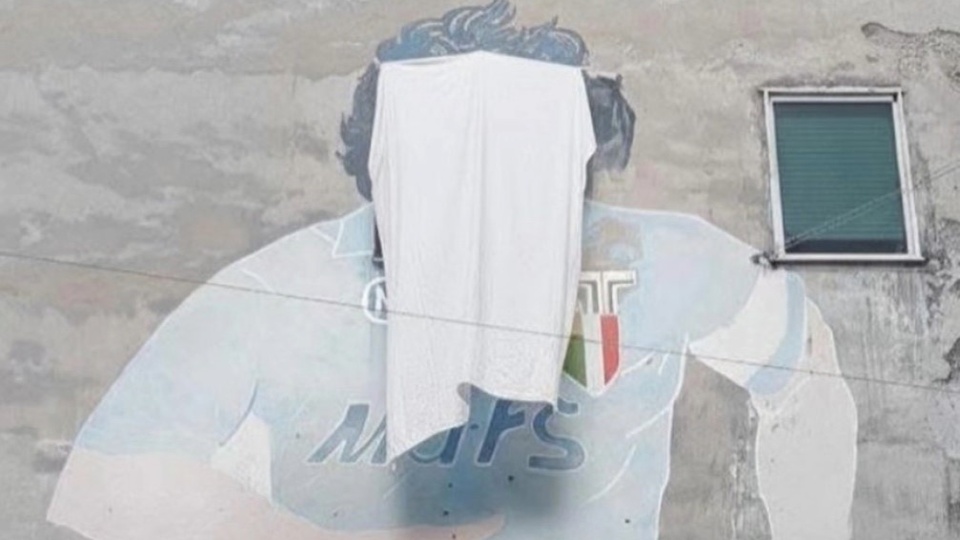 El icónico mural de Diego Armando Maradona ubicado en el Quartieri Spagnoli (Barrio Españole) de Nápoles, en Italia, amaneció tapado este miércoles por una tela blanca en medio de una protesta simbólica organizada por los vecinos de la zona contra la administración municipal, a cargo del alcande Gaetano Manfredi, quien viene ordenando operativos policiales de desalojo de puesteros, manteros y camiones ambulantes que venden remeras, pelotas y otros productos relacionados con el ídolo del fútbol.
