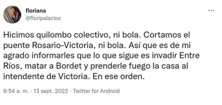 “Hicimos quilombo colectivo, ni bola. Cortamos el puente Rosario-Victoria, ni bola. Así que es de mi agrado informarles que lo que sigue es invadir Entre Ríos, matar a Bordet y prenderle fuego la casa al intendente de Victoria. En ese orden”, apuntó Palacios.