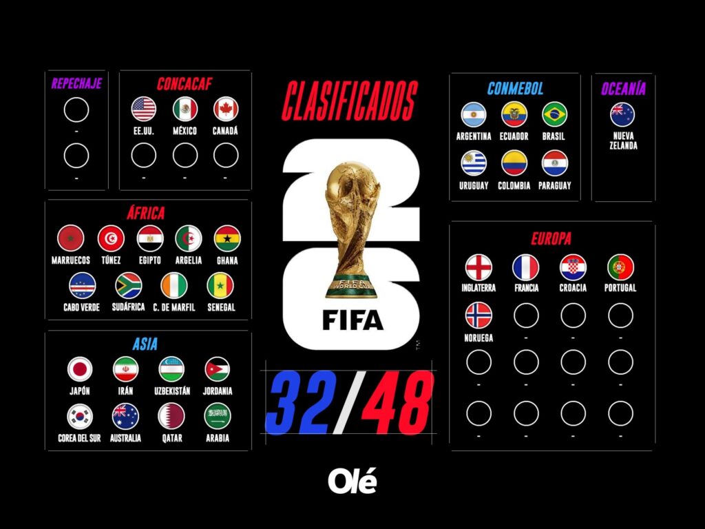 El Mundial 2026 se viene al galope: ya se venden entradas, se presentó la pelota y el 5 de diciembre es el sorteo. Y esta fecha FIFA trajo nuevos clasificados, lo que lleva a un total de 32 (con Argentina entre ellos, naturalmente). Ahora, faltan 16 selecciones (11 de Europa, 3 de Concacaf y 2 del Repechaje) para completar el mapa de los 48 que jugarán la Copa del Mundo.