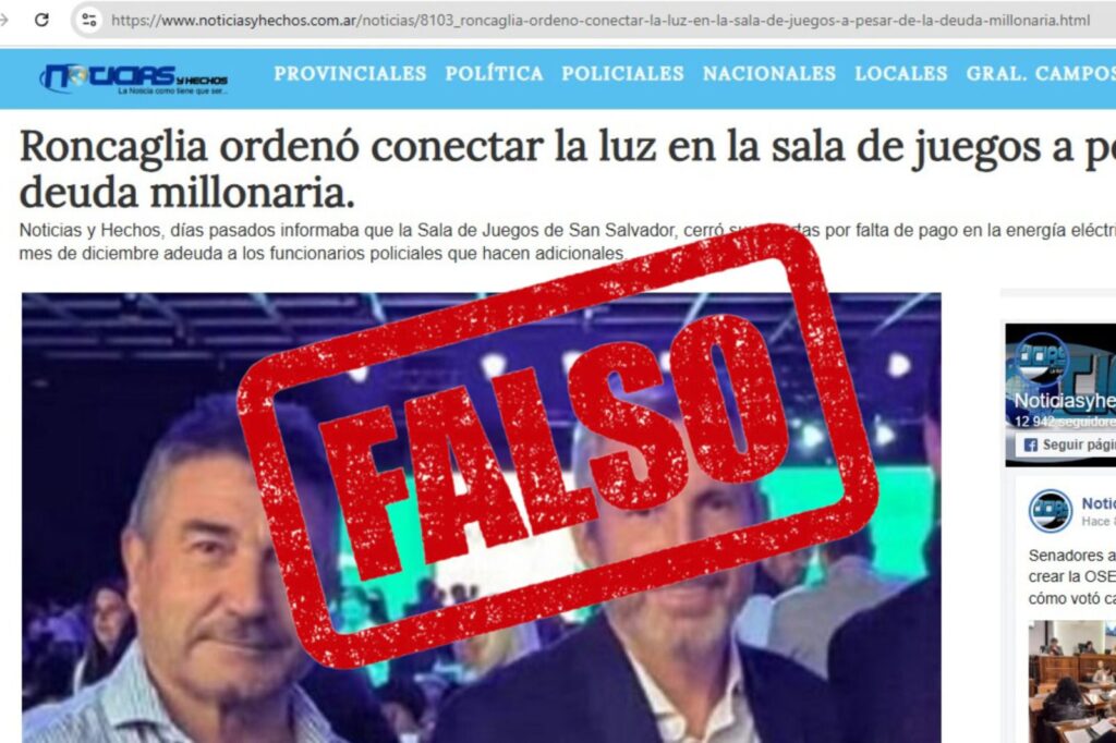 El Ministerio de Seguridad y Justicia aclara que es falsa la información vertida en la publicación: “RONCAGLIA ORDENÓ CONECTAR LA LUZ EN LA SALA DE JUEGOS A PESAR DE LA DEUDA MILLONARIA” del medio digital “Noticias y Hechos”, dirigido por Carlos Challiol , y replicada en la página de facebook “La masiva digital Grupo CAI” de Concordia,, ya que carece de veracidad y busca desinformar a la opinión pública.