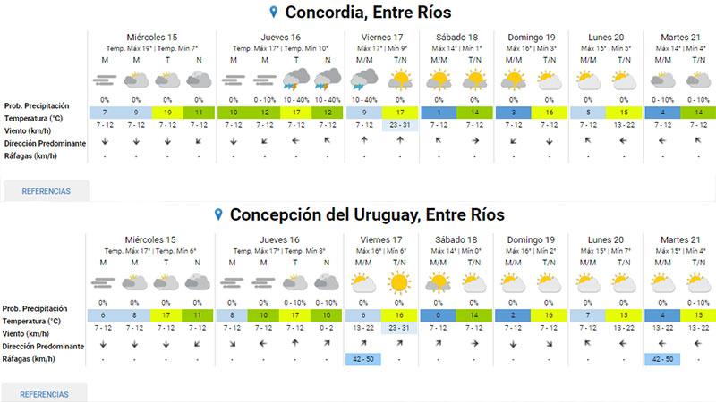 En Entre Ríos se esperan vientos débiles a regulares del noreste con alto porcentual de humedad. “Nubosidad en incremento paulatino desde el sudoeste de la provincia. Vientos rotando al Este durante la tarde. Temperatura mínima en ascenso y máxima en leve descenso”, señala el informe de Defensa Civil provincial. Por ello se estima que los registros térmicos podrían no alcanzar los 20 grados.